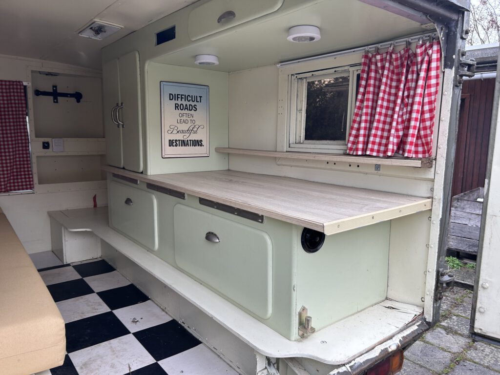 Ein anderer Hinweis führte nach Belgien. Nur 3 Jahre Standzeit, ein überholter 200tdi Motor, Rahmen voll intakt, nur leichter Flugrost. Und der Koffer mit minimalistischem, sehr originellem 70er Jahre Scharm Ausbau. Ich war nicht der einzige Interessent. Viele scharrten mit den Hufen. Also Augen zu und durch. Einen Tag wird sie für mich reserviert. Wegen der weiten Anfahrt. Also ab nach Belgien. „Veni, vidi, vici.“ Ein Händedruck. Und „Bouncing Betty“ wechselte den Besitzer…