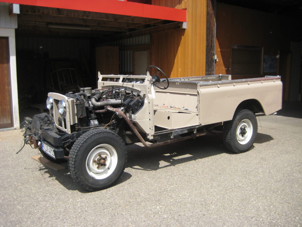 …Gekauft vor ziemlich genau 15 Jahren. Aussen eine Bastelbude vom Feinsten. Innen liebevoll mit Riffelblech verkleidet. Das Armaturenbrett im wahrsten Sinne: ein Brett. Aber: ein verzinkter Rahmen und ein überholter Motor. Das war das wichtigste. Der Rest machbar. Ein halbes Jahr später, nach vielen Paketen aus UK war er wieder ein hübscher Bube. Er („Clarence“) hat mir und anderen seitdem (meistens) sehr viel Spass bereitet. Er musste aber (nach Schrauberunfällen) auch schon das eine und andere schrecklich böse Wort ertragen…